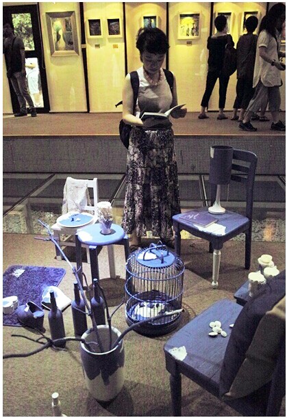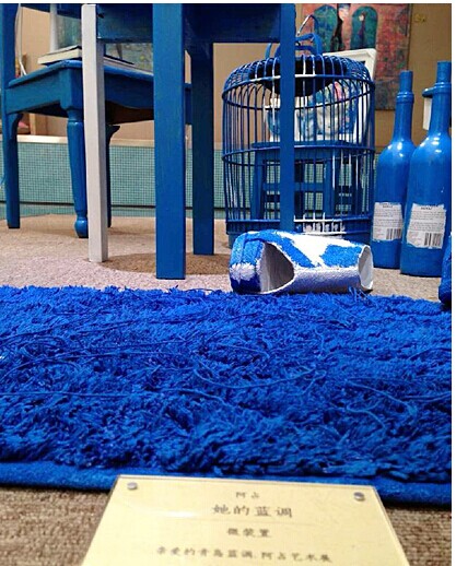 很多人对这个名为《她的蓝调》的微装置发生了兴趣,他们说,这蓝真冷,这蓝真艳。事实上,除了色彩的冷艳,创作意图围绕的是“重建与破坏”。重建,是对废物的重建,这些椅子凳子都是歪斜而不能承重的,台灯是坏的,酒瓶是空的,鸟笼是破损的,鞋子是不合脚的……经过艺术的重建,它们产生了美的功能,带来了想象力。破坏,是重建之上的破坏,破坏力缔造残缺美,是美中之不足。重建与破坏,暗藏辩证统一,有轮回感,也是哲学的人生态度。
