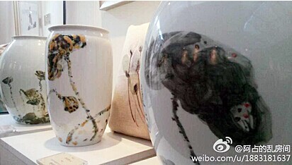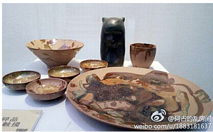 这是展览上的陶艺作品《荷语莲心系列》,照片取自旭峰美术馆创建人孙先生的微信,他说很喜欢我画的莲荷,枯而不死,润而不腻。
