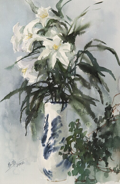 这次展出的50幅作品,均为韩宏伟最近几年的新作,包括风景、花卉、静物等多个题材。虽未刻意于某种学术梳理,仍可较清晰地看到作品的构成脉络。其中,大海与荷韵系列,是韩宏伟个人艺术符号比较突出的水彩创作。