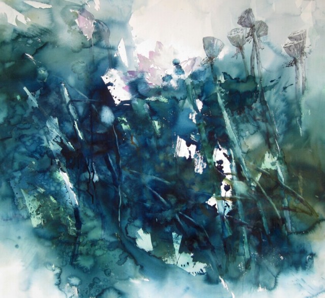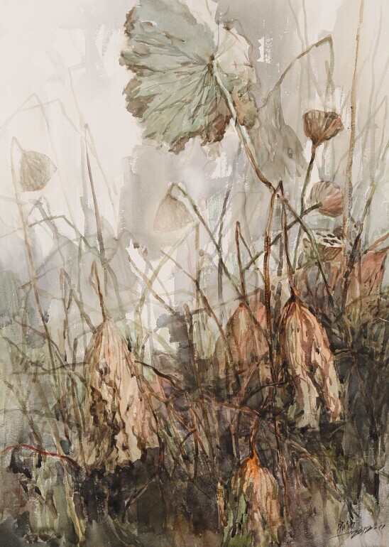 相较于对大海的写实与再现,韩宏伟画作中的荷,则表现出东方笔墨韵味与西方色彩构成的有机相融。荷韵系列中,氤氲的水塘,亭亭的叶子,淡雅的花蕊,摇曳的莲蓬,在水与彩敷设出的冷暖调子中若隐若现,于朦胧间流淌着诗情画意。这些画作对东方意象的表达,记录着韩宏伟将水彩与水墨画相结合的尝试,显现出基于东西方不同文化语境下,对水彩本体语言的探寻、创新与理解。